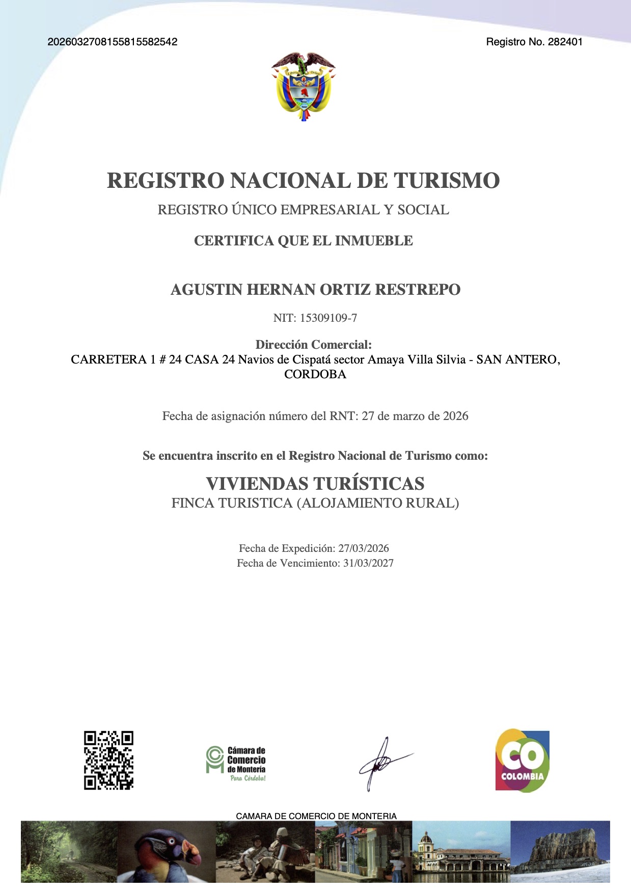 Vivienda Turísticas / Finca Turística (Alojamiento Rural) Registro No.282401